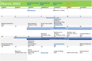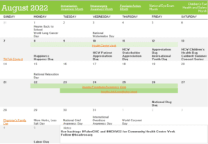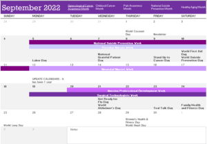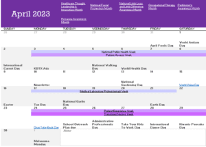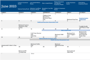 At the top of each month, you will see what “month” it is (June is Men’s Health Month, etc.) Weeks are highlighted. Below each month, there is a link to suggest days of recognition, jean days, and just about anything you’d like to celebrate!